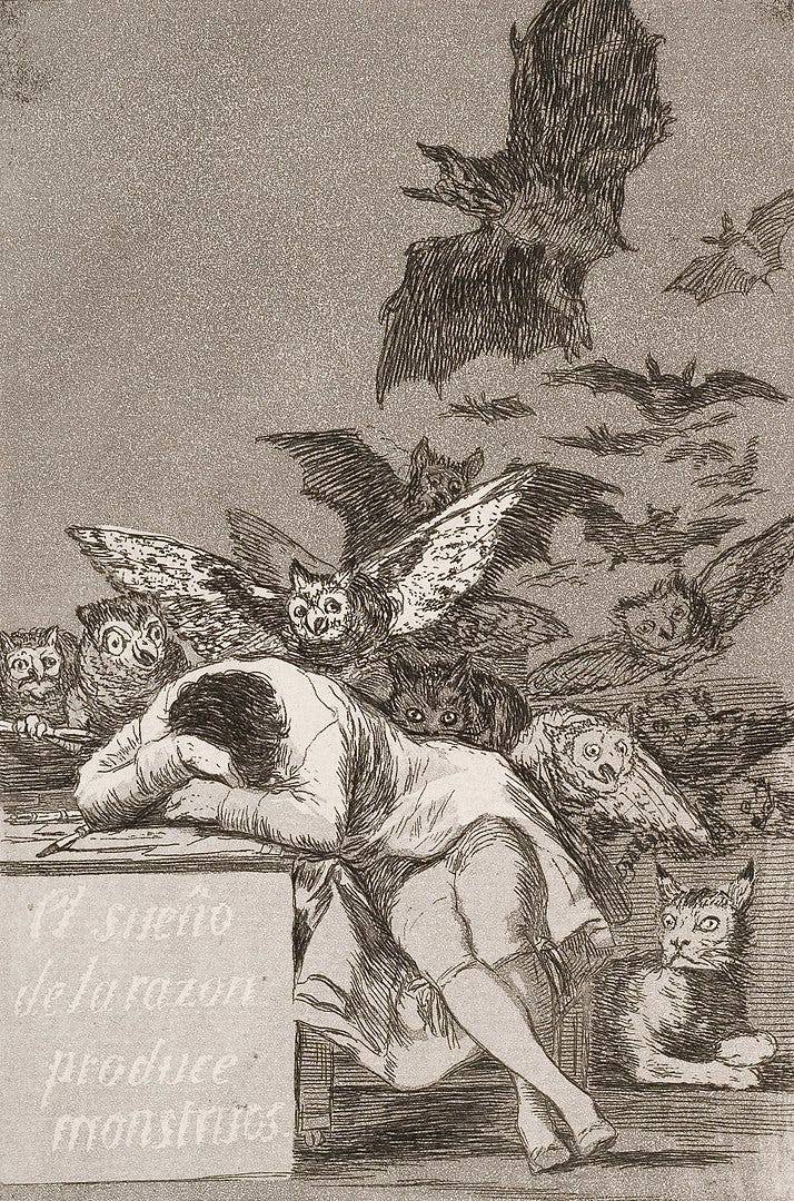 In Goya’s etching it is ‘The Sleep of Reason,’ which is said to ‘Produce Monsters’.